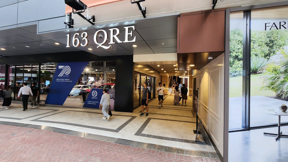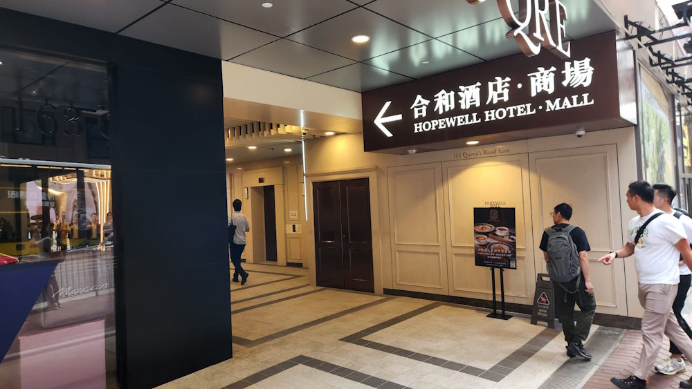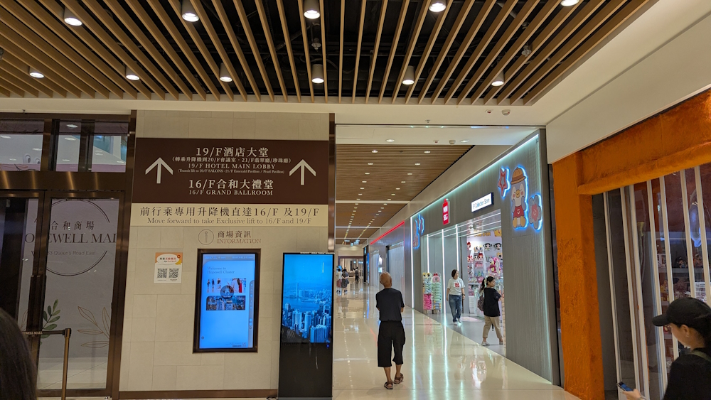 抵達PORSCHE陳列室門口轉右,見到旁邊的「QRE 163」及「← 合和酒店.商場」指示燈箱後,直入上扶手電梯,轉右再一直往前行,即可使用專用升降機直達16樓酒店大堂。